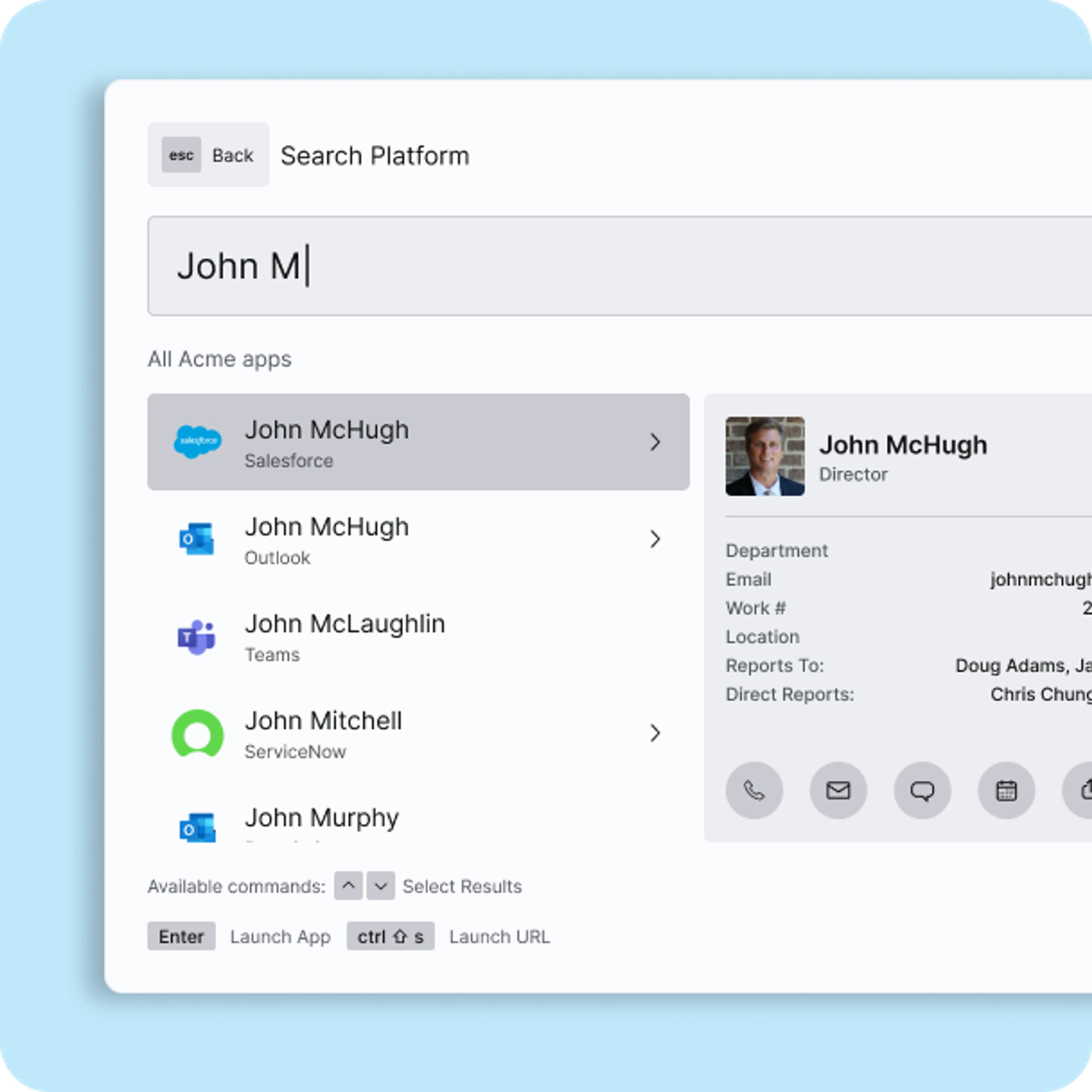 The Home dialog streamlines the search experience across different apps, data sources and AI chatbots. The component enables concurrent delegation to multiple search providers and the display of rich actionable results to end users with filtering options. Developers can define custom commands and also customize result preview cards and filter tags.